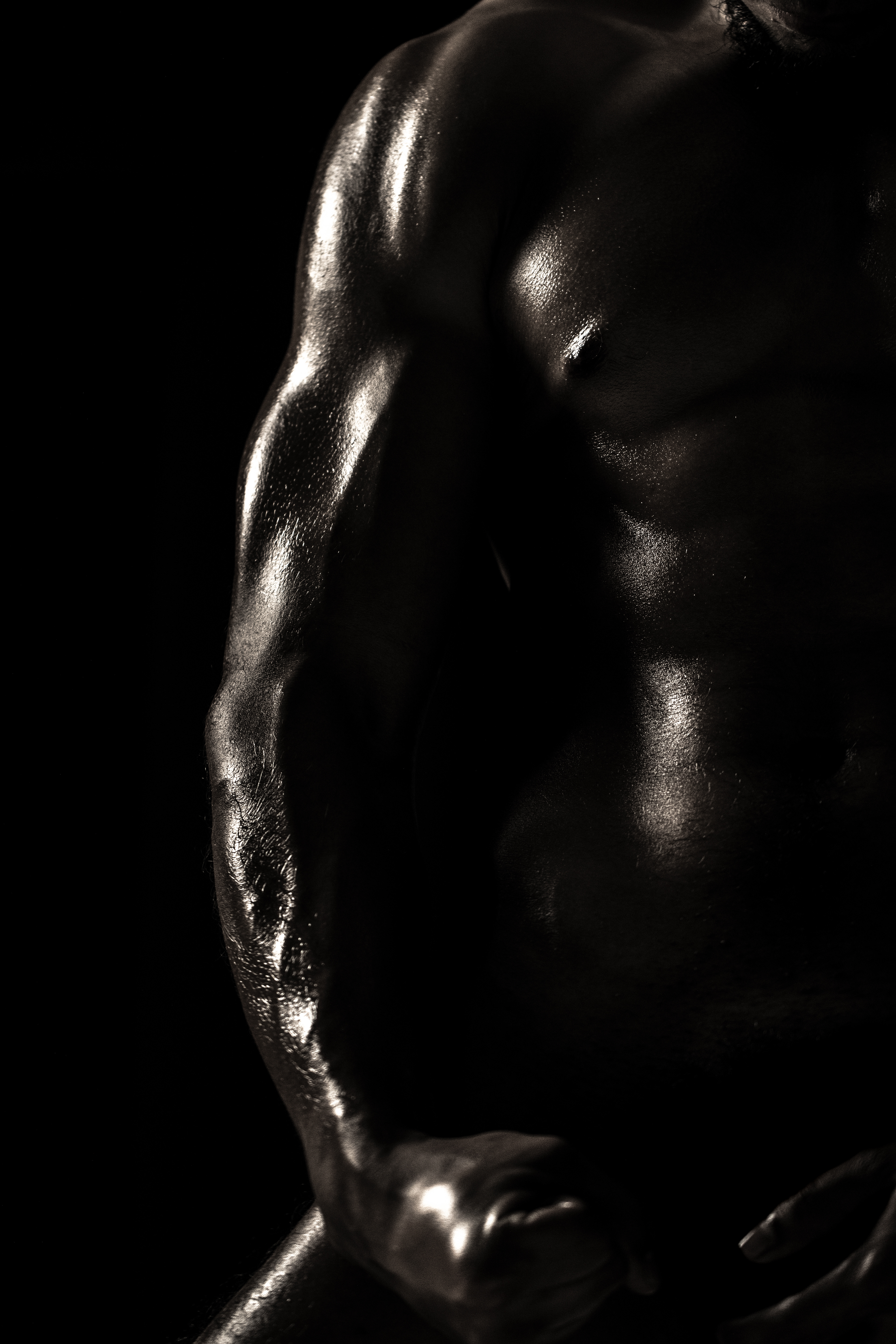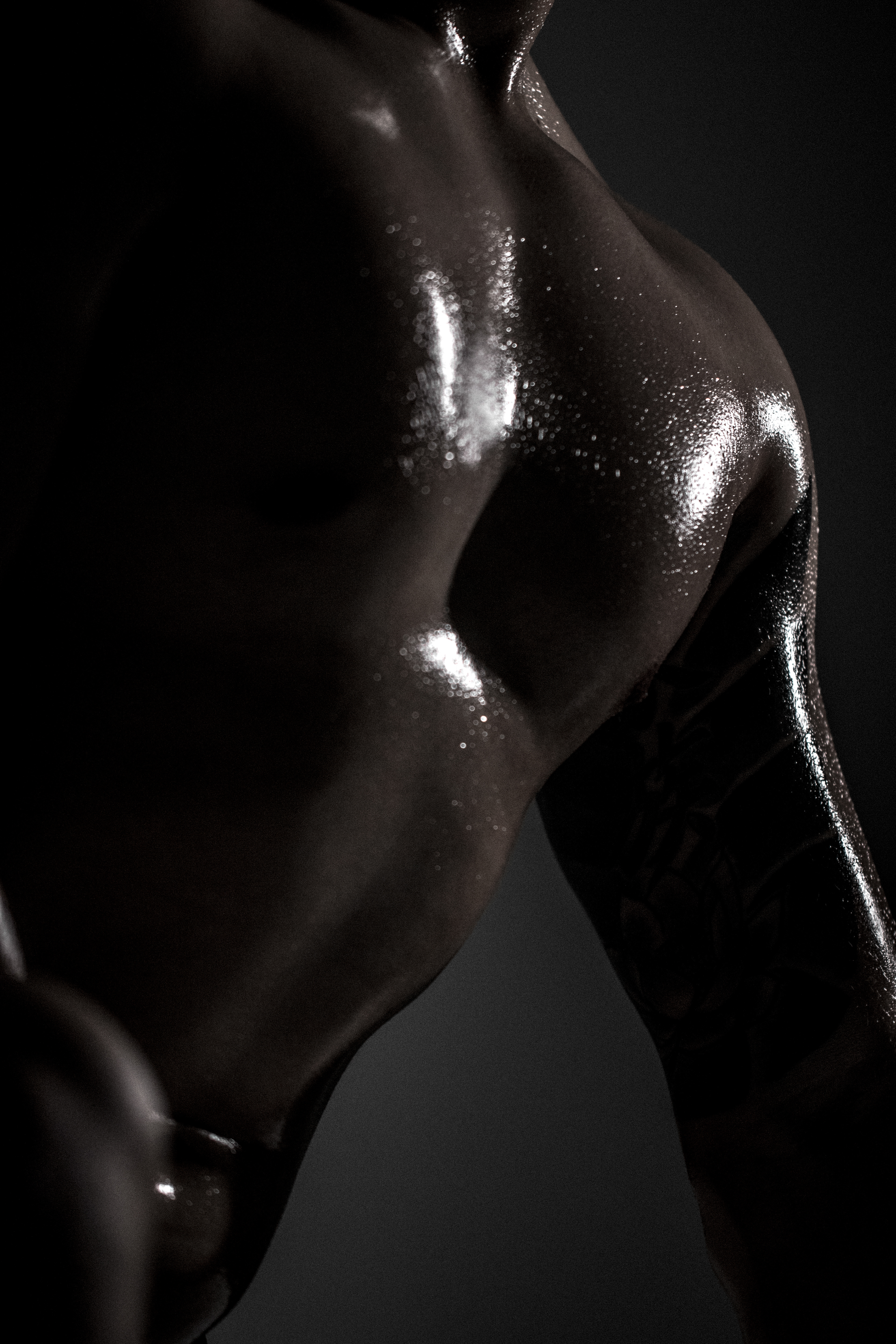 This series evolved over time; while Dudeoir evokes sensuality in men, it also displays other ways sensuality can be shown beyond the boundaries of traditional Boudoir photography. This came about by abstracting the body more and applying materials like water and oils onto the skin. Color also ended up playing a role, and in turn, created a completely different entity conveyed in the muted and black-and-white imagery.